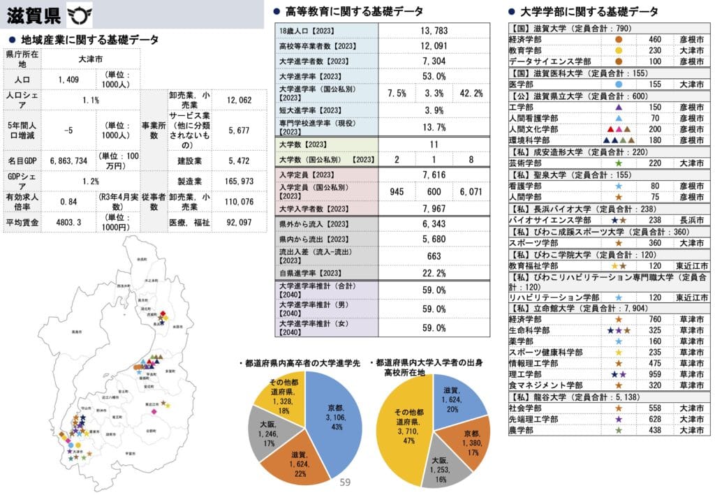 私自身、滋賀県は故郷ではあるので(公式には故郷は京都市)、なんとなく下位である状況はわかります。隣に京都があり、私の実家の最寄りの石山駅からは京都駅まで13分。十分に通える距離です。ただ、こういう状況があったのでしょう。私の記憶頼りですが、2002年当時の滋賀県はかなり大学誘致に力を入れていて、立命館の琵琶湖キャンパスも拡大、龍谷大学や長浜バイオ大学やびわこ成蹊スポーツ大学とか成安造形大学もこの政策の流れで移転してきたり、設立されてきたのではないかと思います。